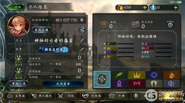 在这里你可以变更你的名称、称号、徽章以及旗帜。右侧为你的游戏段位以及游戏累计分数。下方为阶位对战:职业胜利场数。