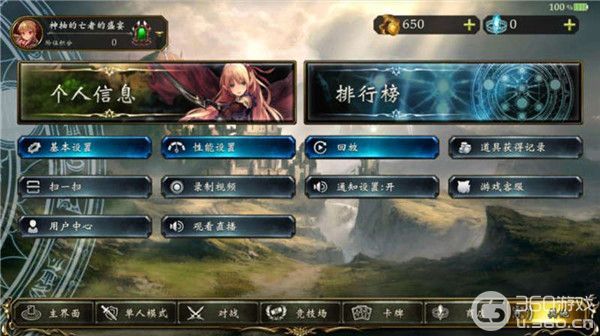 游戏的设置页面。可以在这里对系统进行设定,查看回放(可以查看之前对局的视频)、扫一扫、观看直播、联系客服等。另外账号、密码的修改均在此进行操作。