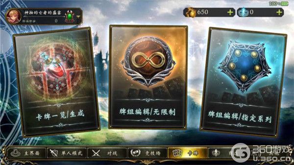 分为牌组编辑与卡牌一览/生成。牌组编辑可以对自己的全部卡牌进行编组处理,每组40张,有指定系列和无限制两种类型。卡牌一览/生成,则是对全部卡牌的浏览以及卡牌的制作。