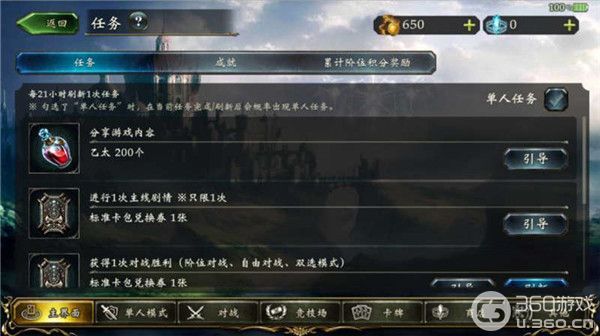 3.任务:任务、成就、累计阶位积分奖励。可以在此查看任务、个人成就和获得过的积分奖励。通常金币的积累是通过完成相对应的游戏任务获取的,当然氪金也可以获取游戏内相应的消费道具。