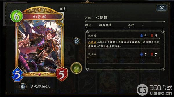 套牌的核心是6费5/5的【幻影猫】,它可以为我们提供伤害和补牌。在中立浓度如此高的一套牌中,往往它的出场代表着4点过墙伤害。就算没有打出4点伤害也不要紧,如果你只打到了2点伤害乃至0点伤害,代表着你抓到了你套牌里为数不多的暗夜伯爵牌。而我们套牌中的暗夜伯爵牌全部可以转换成伤害,这代表着你有机会打出更多的直伤。