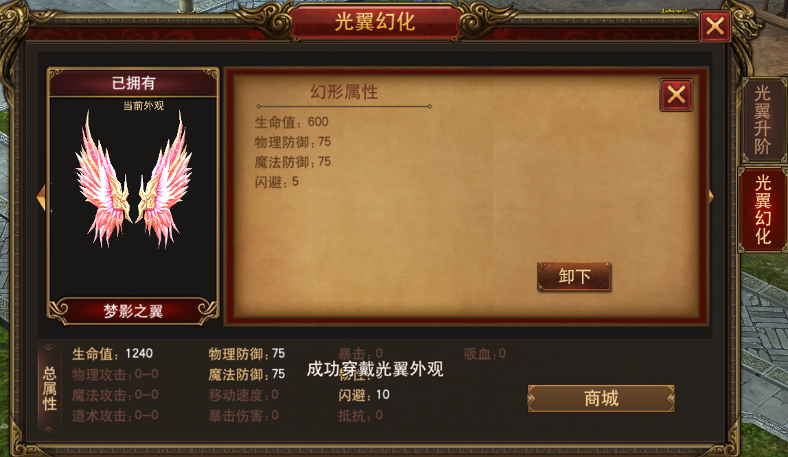 玩家可以在任何一款已进阶的光翼中,选择出自己最喜欢的一款光翼造型进行幻化。当然,更多更炫酷更亮眼的光翼造型仍是在不断更新的。同时,只要玩家拥有了光翼,就会增加巨额的属性值,光翼的类型越多,增加的属性值也就越庞大。