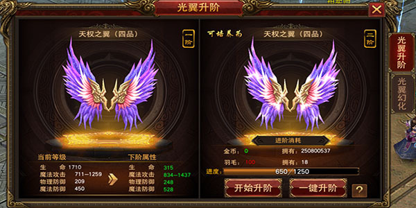 当材料准备好了之后就可以进行光翼的升阶了,如果觉得升阶点击比较慢,还可以点击“一键升阶”,让升阶变得更快速。
