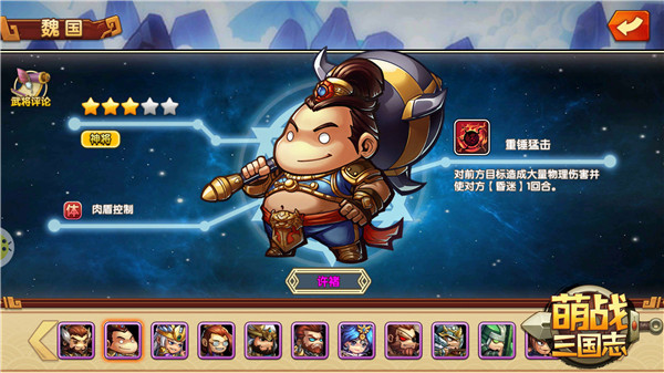 根据记载,许褚长八尺馀,腰大十围,容貌雄毅,勇力绝人,是个名副其实的“小巨人”。他后来追随曹操,自典韦战死之后,主要负责曹操的护卫工作,是曹操最信任的魏国武将之一。在《萌战三国志》中他是否同样值得信任?一起来看看吧!