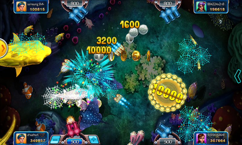 游戏中每个房间最多能提供四个玩家同时在线捕鱼。而玩家自己的视角看过去,自己的炮是红色的,而其他玩家的是蓝色的,以示区别。从这点上看玩家制作方是从玩家角度来为玩家开发游戏的。
