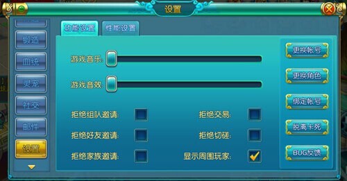功能设置:游戏音效的音量调节,游戏音乐的音量调节,拒绝组队邀请,拒绝好友邀请,拒绝家族邀请,拒绝交易,拒绝切磋,显示周围玩家。