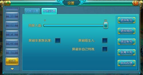 性能设置:同屏人数5人~50人区间调节,屏蔽非家族玩家,屏蔽陌生人,屏蔽非自己特效