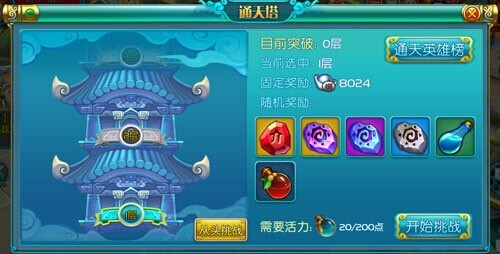 通天塔每挑战一次消耗玩家活力20点,每天会根据玩家楼层的排名统计到通天英雄榜里面,玩家可以在这里查询通关名次靠前的玩家,统计时间为每日的24:00(也就是次日的00:00)玩家可手动重置挑战楼层。