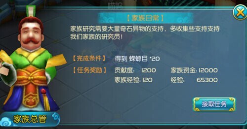家族成员每天都可在“家族总管”接取家族日常任务,该任务是获得家族贡献度、家族经验和家族资金的主要渠道,当然,也是重要的经验获得地方哦!该任务非常简单,花点时间即可完成,性价比非常高,为每日不可错过的任务哟!