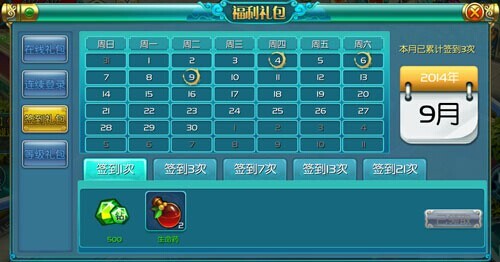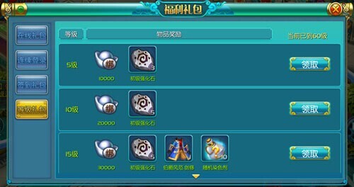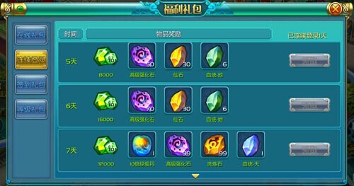 玩家登陆游戏可从主界面子菜单中点击福利礼包。福利礼包内包含:在线礼包,连续登陆奖励,签到礼包,等级礼包