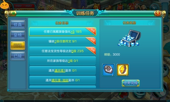 目前游戏中有一个是富有特色的修真任务,一类是颇有乐趣的日常任务。同时,也增加一个训练任务。