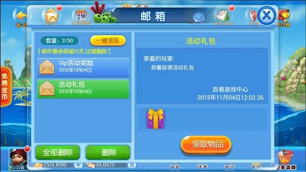 邮件功能:游戏中的各项重要通知,以及活动礼包发放等都可以通过邮件发送给玩家。请各位玩家注意查看邮箱哦!此次《真人街机捕鱼》版本更新不但新增了游戏功能,还对游戏字体、界面等细节进行了一系列优化。为给玩家提供更好的游戏体验,我们将全心全意不断努力!