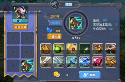 选好英雄,并选择英雄身上要精炼的装备后,就可以开始添加精炼材料啦! 白色品质的装备是不可以精炼的,所以精炼之前要先挑选好品质较高的装备。