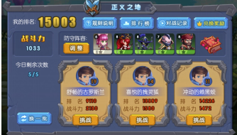 每次进入正义之地,系统会随机 3 个排名在你前面的玩家。点击玩家头像可以看到该玩家的防御队伍,所谓知己知彼,百战 不殆。了解了对方的阵容,就可以选择针对性的阵容和英雄了,哪怕战斗力低于对方也有很大的可能获胜。 要是觉得挑战这些玩家没有必胜的把握,你可以点【换一批】来重新随机 3 个玩家。 因为每天免费的挑战次数只有 5 次,所以一定要慎重选择对手哦!