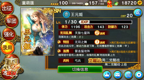 王元姬在《真·三国无双 爆发》五大势力中位于晋国,她非但是一位女性武将,更是需要消耗28000点才可以兑换到的强力SR武将。作为一名COST值为20的武将,王元姬的初始三维分别为:体力1196、攻击力143、防御力123。虽然防御力在28000点兑换组中并不高,但王元姬远程镖模的设置使得她拥有极高的输出伤害。无双乱舞“天狼七星阵”消耗无双槽2格,特技“无双之舞”消耗1格无双槽,在减弱武将移动速度的前提下将提供迅速恢复无双槽的效果,提供了整个团队强大的续航能力。所以无论是作为主将还是副将,王元姬在晋国阵容中都具有非常高的价值。