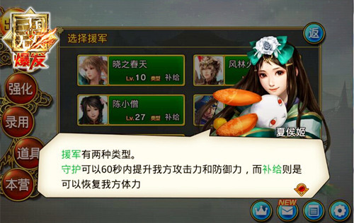 援军是在玩家初期在新手教程中就会接触到的系统,战斗开始前,可以选择同一服务器中的玩家与你一同参战。援军共分为两大类型:守护型与补给型。前者可以在60秒内提升我方的攻击力、防御力,后者可以恢复我方战斗人员体力,根据战场作战情况的不同,两种类型的援军都将发挥至关重要的作用。作战结束后,将会收到来自系统的提示,可以将该名玩家作为好友添加。