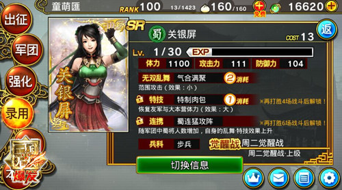 关银屏与其他三位SR武将同为8000点可兑换武将,其初始属性中cost值为13,具备成为游戏后期使用武将的条件。从三位属性上来看,体力1100排在第三,攻击力111位列张辽之后,防御力104也算是中规中矩。另外无双乱舞范围较小,消耗2格无双槽,关银萍的优点在于特技“特质肉包”恢复友军与大本营体力,效果大,耗无双少,这使得她成为了蜀国路线后期颇有潜力的副将,另外连携技蜀连猛攻阵也算是比较不错的主将技能,应该说使用关银萍度过前中期并无大碍,并且在后期可以顺利转型成为副将。