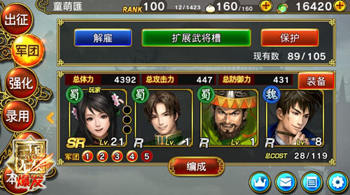 最后再说一下以关三小姐作为主将的军团配置,关银屏的连携技为蜀国猛攻阵,与之前介绍的朱然一样,这是游戏中公认的最强连携技,可以以此来打造一支全蜀国阵容。如果没法完全凑齐一套兼具攻击加成、恢复、破坏和高COST的蜀门,那么只能想办法用功能相同的武将来替代咯,下图就是小编自己的关银屏核心阵容。