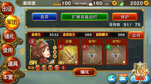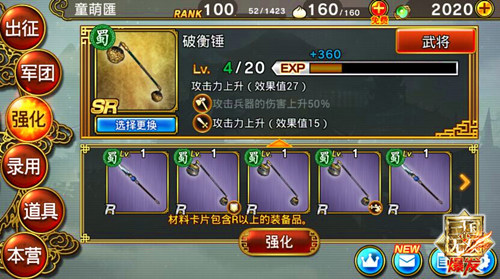 《真·三国无双 爆发》中每名武将都能装备上武器和饰品,这些装备能给武将提供高数值的攻击、防御、体力等基础属性加成。与游戏中武将的强化相同,武器也是可以强化的。通过吞噬其他的武器,根据品质的不同,将获得对应的经验值:N级装备为5,R级装备40,SR级装备70,如果强化素材为同势力的武器,将得到1.5倍的经验值。由于游戏后期玩家会拥有不同势力的多套阵容,所以小编在这里给出的建议是:武器强化时尽量只用相同势力的素材,这样待到游戏中后期可以兼顾到其他势力军团的发展。