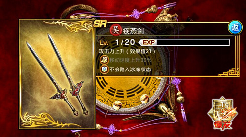 《真·三国无双 爆发》中的装备不仅可以提升武将三维,在这其中更有极少数出类拔萃的武器可以在武将攻击时提供额外的特效。目前游戏中的武器特效涵盖的种类繁多:有提升三维属性百分比;每场战斗结束后恢复体力;更有一些堪称BUG的特效如攻击中有一定几率冰冻对手,或在战斗中不会陷入冰冻、晕眩状态的。另外值得一提的是,作为武器系统中的翘楚,SR等级的武器将比R和N的武器更多出一个随机特效属性,成功将SR武器升至满级20以后就会解锁该属性,从此一把旷世神器便出现在三国世界中了!