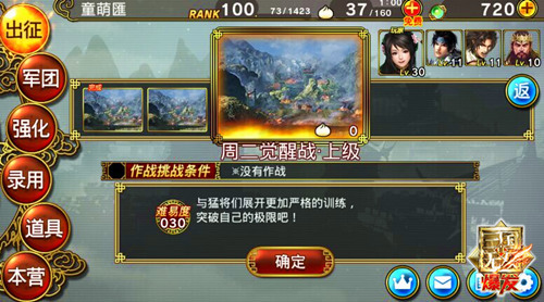 《真·三国无双 爆发》中每位武将从周一到周五都有对应的觉醒日,游戏初期小编选择了关银屏这位女性武将,她的觉醒日在周二,目前已知在同一天觉醒的武将还有魏势力夏侯惇,吴势力朱然、太史慈,晋势力钟会和王元姬。觉醒战分为上级、中级、下级三种难度,分别对应SR、R和N三种卡牌的武将,玩家需要将觉醒武将作为主将,组建军团前往挑战,战斗前同样可以邀请好友作为援军,将在战斗中提供非常大的帮助,通关以后还会得到排名点和武将卡牌奖励。