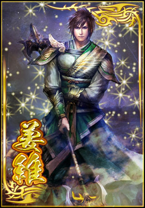 字伯约。蜀将。最初为魏将,但后来被北伐时的诸葛亮看中,施计令其降服于蜀。心服于诸葛亮的姜维被作为继承者深受信赖,得到了所有兵法知识的传授。诸葛亮死后,继承了他的夙愿多次出兵北伐。