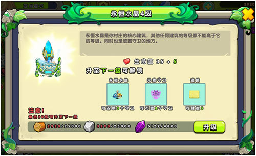 建筑为村庄内核心建筑,该建筑在对战时为主要保护核心,下方会显示水晶总血量;在一场对战掠夺中,若水晶血量损失既卑掠夺成功,掠夺资源按照总血量百分比获得掠夺资源。