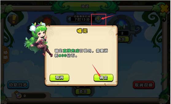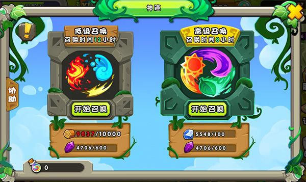 点开召唤界面可使用低级召唤或高级召唤,不同点是召唤时间和召唤材料,两种召唤都可在开始召唤之后使用加速功能马上完成(召唤界面内的闪电按钮)。