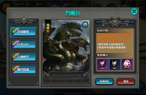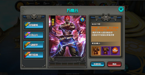 玩家需要根据战阶要求选择进入相应的关卡,每人每天可以挑战1次。 每个万魔谷副本都分为6层,每一层皆有不同的玩法,或者会有让人猝不及防的机关,或者BOSS拥有更加多变灵活的技能,只有掌控了BOSS的打法,不要一成不变的硬上,才能够更加轻松的攻陷副本。