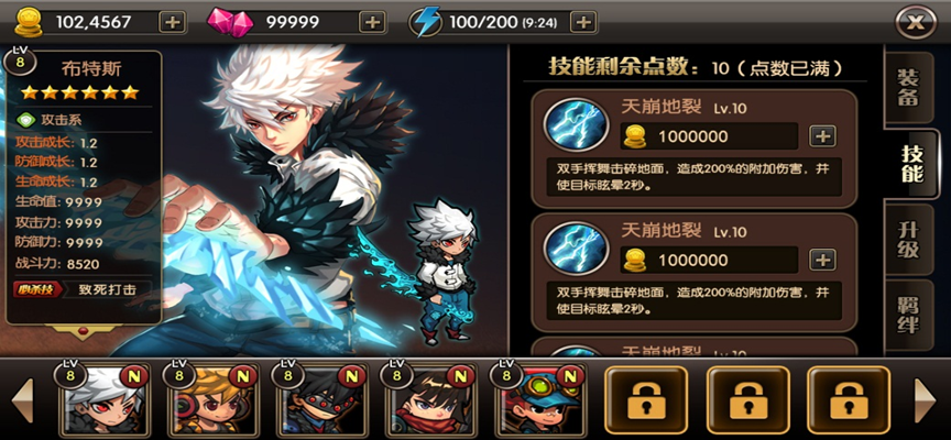 【猎人技能】:猎人可以通过点击技能按钮进入升级技能界面,随着猎人等级的提升玩家可以消耗一定的金币来提升猎人的技能等级(第三个技能为怒气大招)。