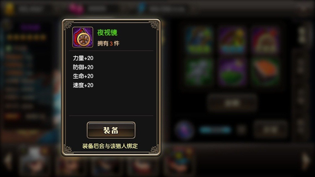 在猎人等级达到装备要求的情况下,装备槽将显示绿色的“+”号;而有可穿戴装备,但猎人等级未达到装备所需等级时,“+”号为黄色。点击“+”号确认装备,该装备将与猎人绑定,其他猎人不可再穿戴。