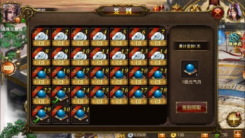 签到,每日的签到奖励,签到时间越长,奖励越丰厚,如果漏签还可以补签哟!