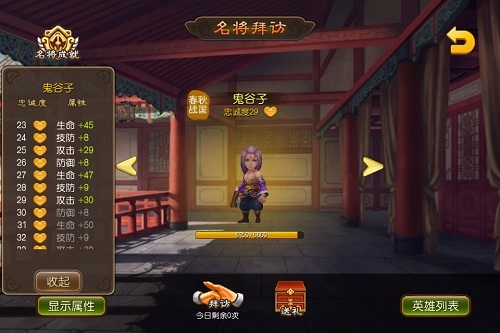 名将拜访:名将拜访是每日拜访英雄,给英雄送礼,提高其忠诚度。忠诚度直接影响到该英雄的攻击,防御,生命,技防。忠诚度越高,这四个属性加的越多。