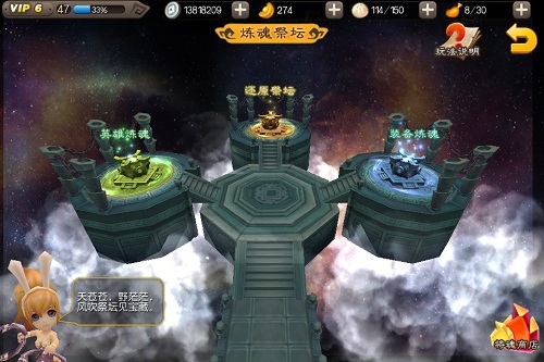 第二个是炼魂祭坛,分别为英雄炼魂,还原祭坛,装备炼魂。