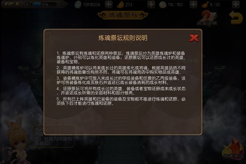 三种祭坛通过炼化或者还原后的英雄,装备,都将无法还原,所以前期一些甲级英雄或者套装装备,不要轻易炼化,等确定自己要上阵的英雄以及其缘分后,然后在考虑把与其无缘的英雄炼魂。装备可在阵容界面点击一件装备,会自动挑选比当前好的装备穿上,剩下的在考虑去炼魂。具体可查看玩法说明。
