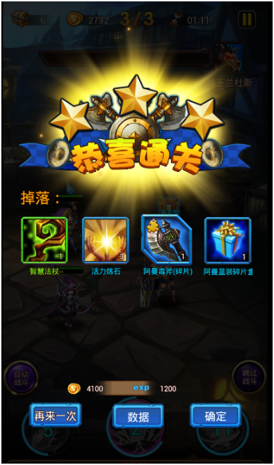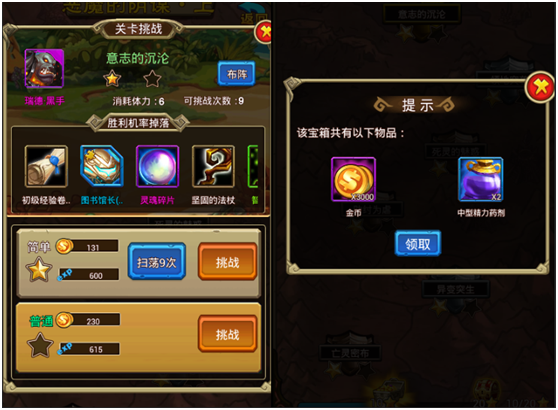 成功通过副本可获得大量金币和经验奖励,副本怪物还会掉落经验卷轴,装备,英雄碎片等物品。副本分为简单、普通、困难三个模式,每个模式初次通关时都可获得一颗星星,每章节中所得到的星星数达到一定数量后还能开启宝箱获得额外的丰厚奖励。