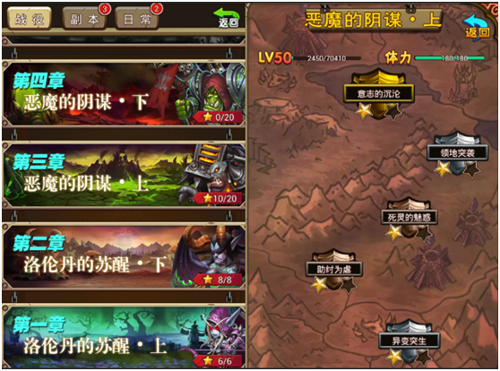 穿越黑暗之门,勇闯黑暗神庙。在战役模式中可以体验游戏中经典的剧情战斗。战役模式分成数个章节,每章中都有数场战斗等你去挑战(每次挑战需要消耗一定体力)。