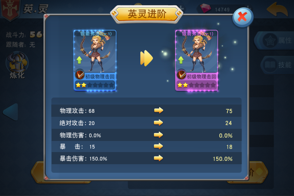 在召唤出英灵后,可以继续收集他对应的英灵碎片,在集齐一定数量的碎片后,可以将其进行进阶,进阶后,英灵的品质会提升,各项战斗能力也会大幅提升。