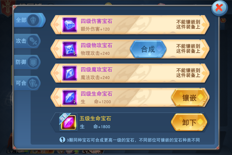 点击已开启的宝石孔可以查看所有的宝石,并可进行合成操作,每三个相同的宝石可以合成一个更高一级的宝石。