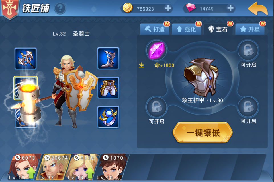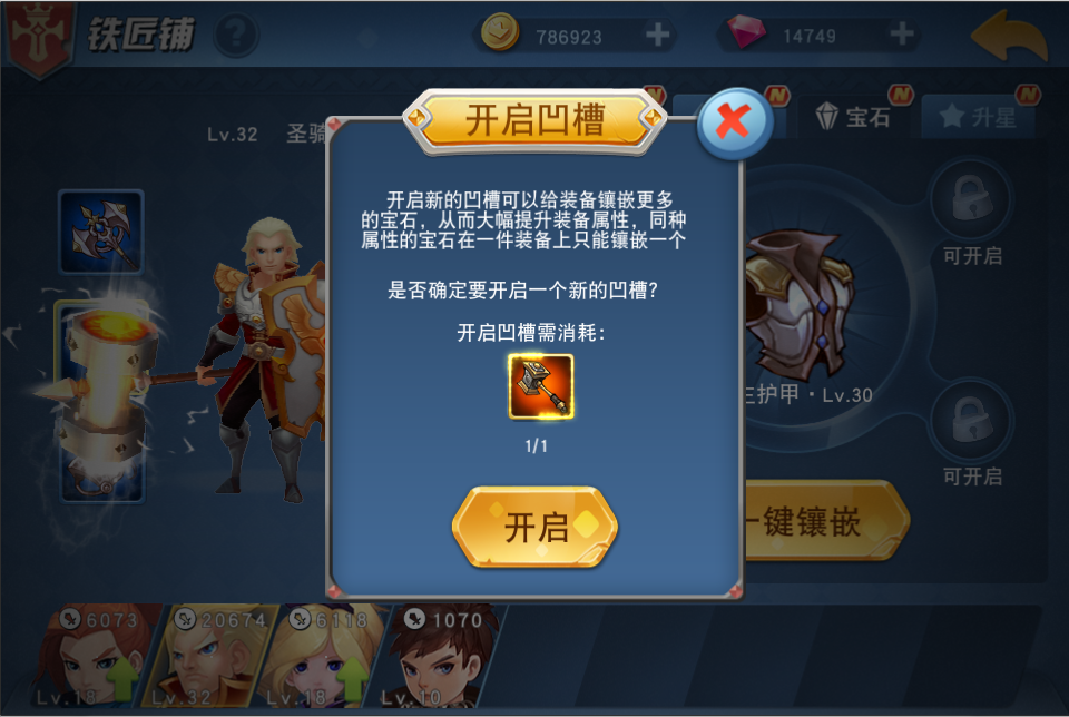 铁匠铺的宝石镶嵌在战队达到11级时开放,在10级开放的无尽挑战系统中,大家会获得大量的宝石,在铁匠铺的宝石页签下,大家可以给装备镶嵌各种宝石。