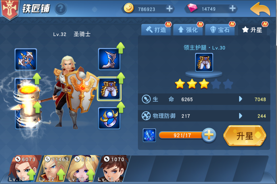 当你的战队达到22级时,铁匠铺中会出现一个新的页签:升星。大家可以通过每天的联盟副本获得非常稀有的升星石,武器在升到一定星级后,外观会变得改变,霸气而绚丽的特效会环绕在主角的武器上闪闪发光,武器的外形改变会随着星级的提高越来越高级。