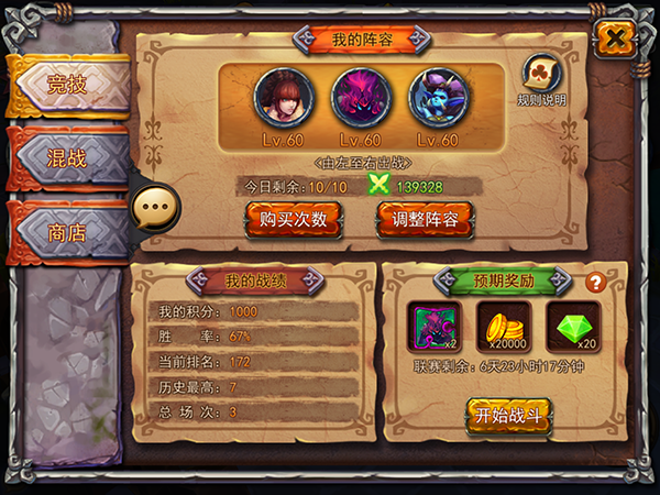 3) 竞技玩家必须设置3个上场英雄,以设置的先后顺序为英雄上场的顺序,如果少于3个英雄则不能进行竞技场战斗;