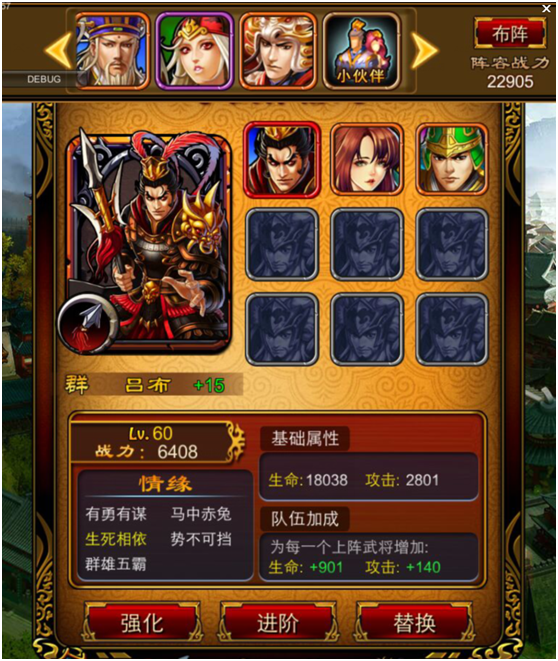 游戏中的情缘多种多样,创新的小伙伴系统,让玩家不用再为选择情缘而烦恼。玩家可以将武将放置在小伙伴界面中,来激活主武将的情缘,并且还有战力加成哦