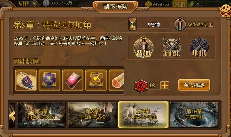 1. 现有11个副本,从第序章到第10章。每个副本都有其故事,多是根据历史中某场著名的海战改编而成的。(例如第九章:特拉法尔加战役,对拿破仑战争熟悉的朋友肯定不会感到陌生)