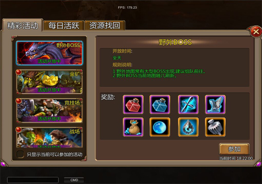 野外BOSS是一项全服玩家共同参与的史诗级任务活动,玩家每天可以在精彩活动里接取到野外BOSS的任务。活动全天开放,届时玩家可以点击精彩活动按钮野外BOSS选择所要击杀的BOSS等级即可传送进入并会与之作战。野外地图常有大型BOSS出现,BOSS实力强大毋容置疑,玩家需要共同努力才有机会击败他,成功击杀后将可以领取到丰厚的奖励。