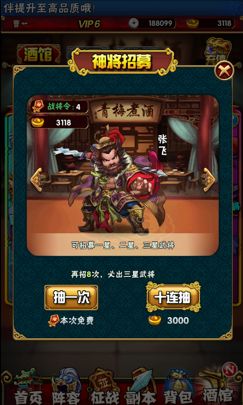 在酒馆系统中,分为战将(对应抽最高2星)、神将(对应最高3星)、吴将(对应最高3星武器)三个模块,其中战将需要点将令抽取英雄,神将与吴将则是需要元宝。