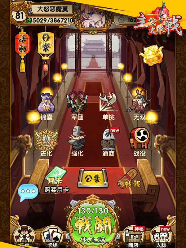 《主公大作战》游戏开始后,跟着指引迅速完成新手引导。然后建议买个月卡,屯着将来十连抽。这里买月卡的好处是可以提升游戏速度,可以直接略过战斗,这样会大大加速游戏进程,前期很重要。当然如果一定不想花钱,那么可以按照以下操作来: