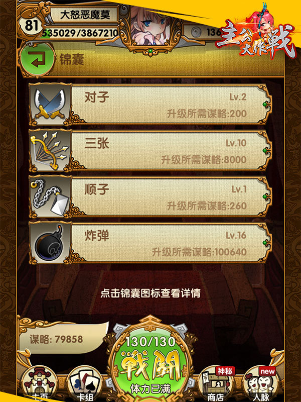 1、锦囊型:锦囊能提升每次出牌攻血加成,最易变换的3个锦囊是炸弹、三张、顺子,其中炸弹的效果最为显著,7级五张炸弹能有300攻击900血量的加成,所以无论是前期还是后期,针对炸弹锦囊来配置手牌能大大提升卡牌的战斗力。