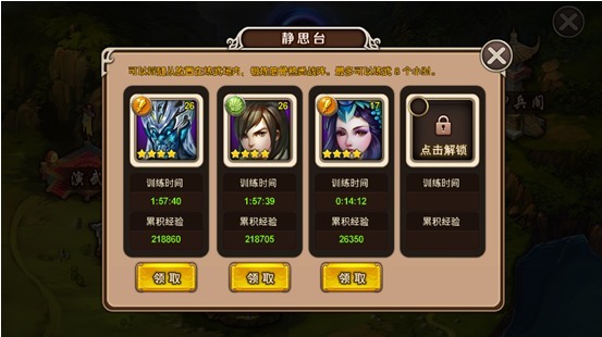 静思台可以将护卫放置在练武场,锻炼筋骨熟悉战阵,最多可以练武8小时获取经验,静思台在目前版本可是护卫获得经验的只要来源地方,所以大侠们一定要多多留意护卫的锻炼时间。
