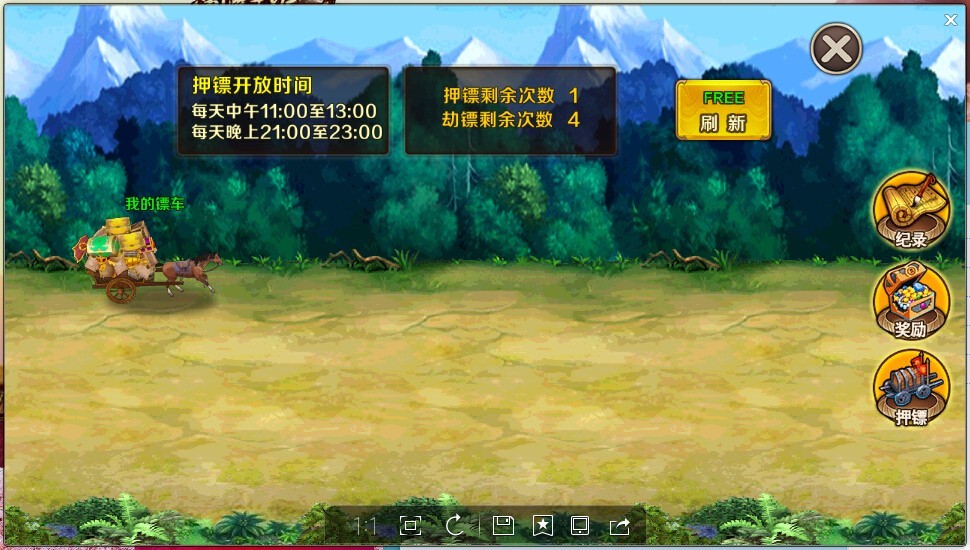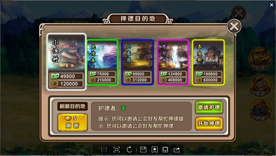 押镖每日可免费刷新一次镖车等级,可花费元宝继续进行刷新,等级越高奖励越丰厚。为了避免被劫镖,建议还是邀请公会好友进行护镖哦,又能保平安,还能增进感情,何乐不为?押镖所需时间为20分钟,如果被劫镖了将会损失40%的奖励。
